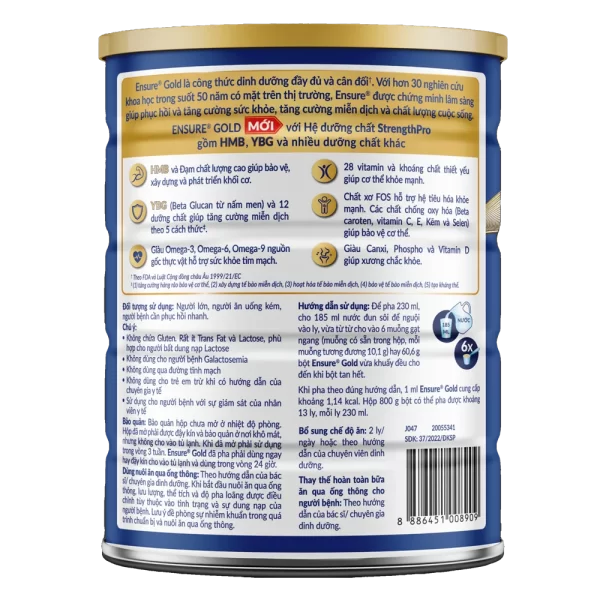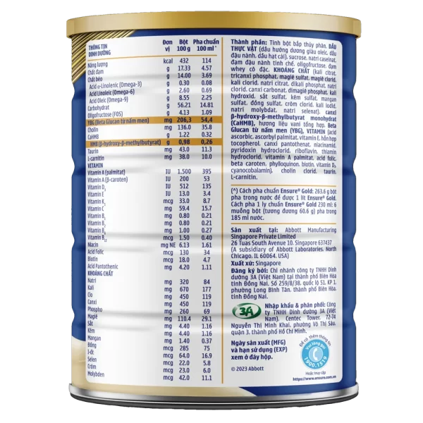 | Hướng dẫn sử dụng | Để pha 230 ml, cho 185 ml nước chín nguội vào ly, vừa từ từ cho vào 6 muỗng gạt ngang (muỗng có sẵn trong hộp, mỗi muỗng tương đương 10,1 g) hay 60,6 g bột Ensure Gold vừa khuấy đều cho đến khi bột tan hết. Khi pha theo đúng hướng dẫn, 1 ml Ensure Gold cung cấp khoảng 1,14 kcal. Hộp 800 g bột có thể pha được khoảng 13 ly, mỗi ly 230 ml. |
